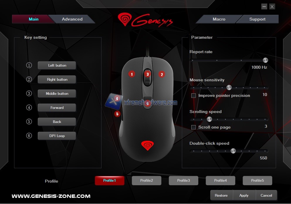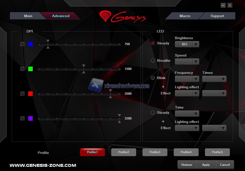 Il software si basa su quattro Menù che sono ‘’Main’’, ‘’Advanced’’, ‘’Macro’’ e ‘’Support’’. Non mancano 5 Profili presenti nel lato inferiore della GUI con cui potremo creare diversi Profili a seconda del gioco o applicazione.