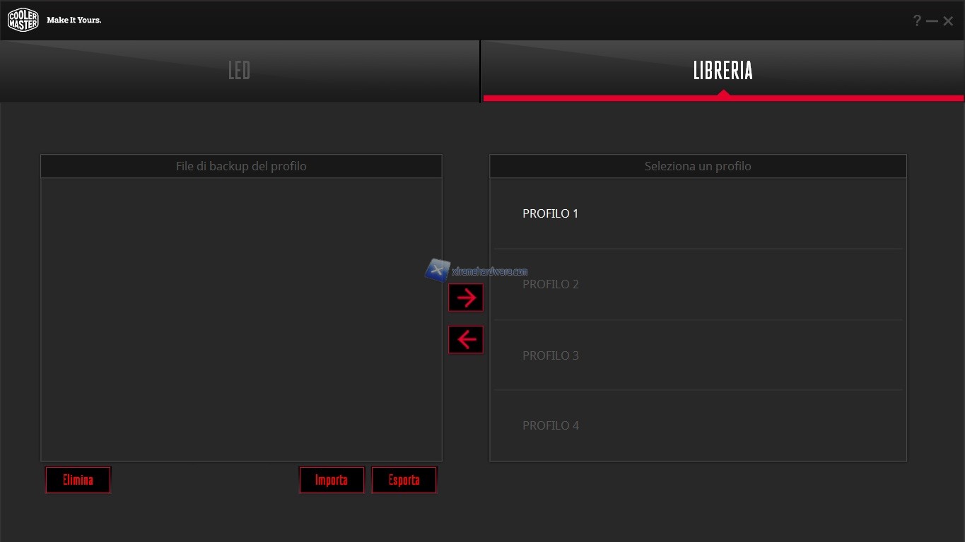 Come vediamo Cooler Master ha creato un software dalla grafica molto essenziale e di facile utilizzo. Il software ci mette a disposizione due Menù principali che sono ‘’LED’’ e ‘’Libreria’’.