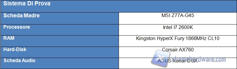 Il sistema utilizzato è una classica piattaforma Intel Z97 ATX con una scheda grafica modello GTX 670 che non supera i 30 cm di lunghezza. Riportiamo comunque una tabella con il riassunto dettagliato della configurazione utilizzata.