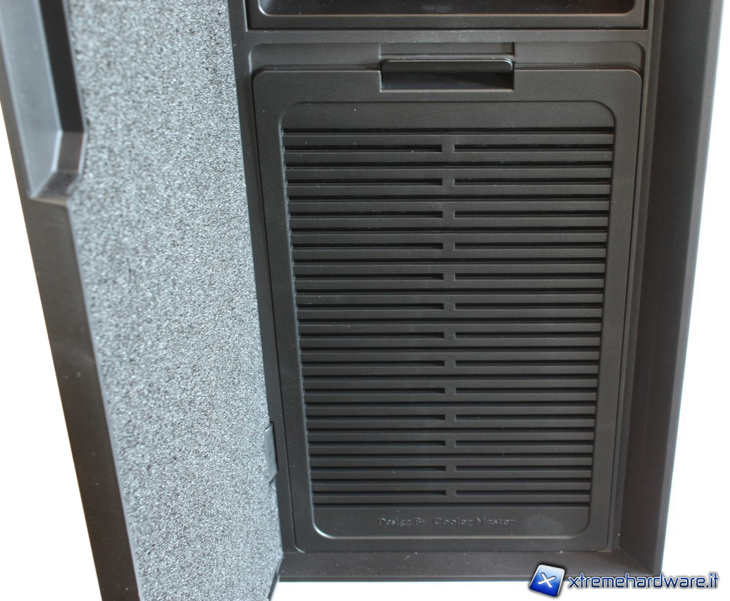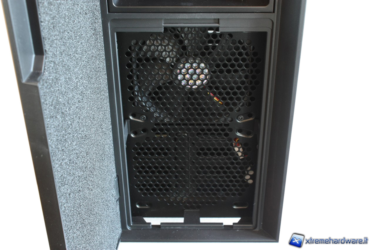La sezione frontale incorpora uno sportello con un meccanismo di chiusura magnetico. Una volta aperta la paratia,possiamo notare che è presente del materiale fonoassorbente per ridurre il rumore generato dalle ventole frontali.