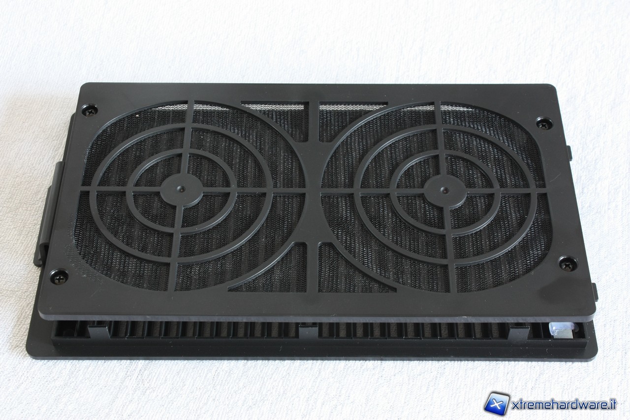 Particolare attenzione è stata dedicata al sistema di filtraggio per le ventole frontali; un comodo e pratico filtro sganciabile dall'esterno è stato posizionato in corrispondenza delle ventole di immissione, una soluzione pratica e veloce che permetterà di pulire il filtro senza sganciare la paratia frontale. Il filtro avrà il ruolo di ostacolare l'entrata della polvere nel Silencio al fine di non danneggiare il nostro hardware interno e di garantire sempre la massima efficienza dei sistemi di dissipazione presenti.