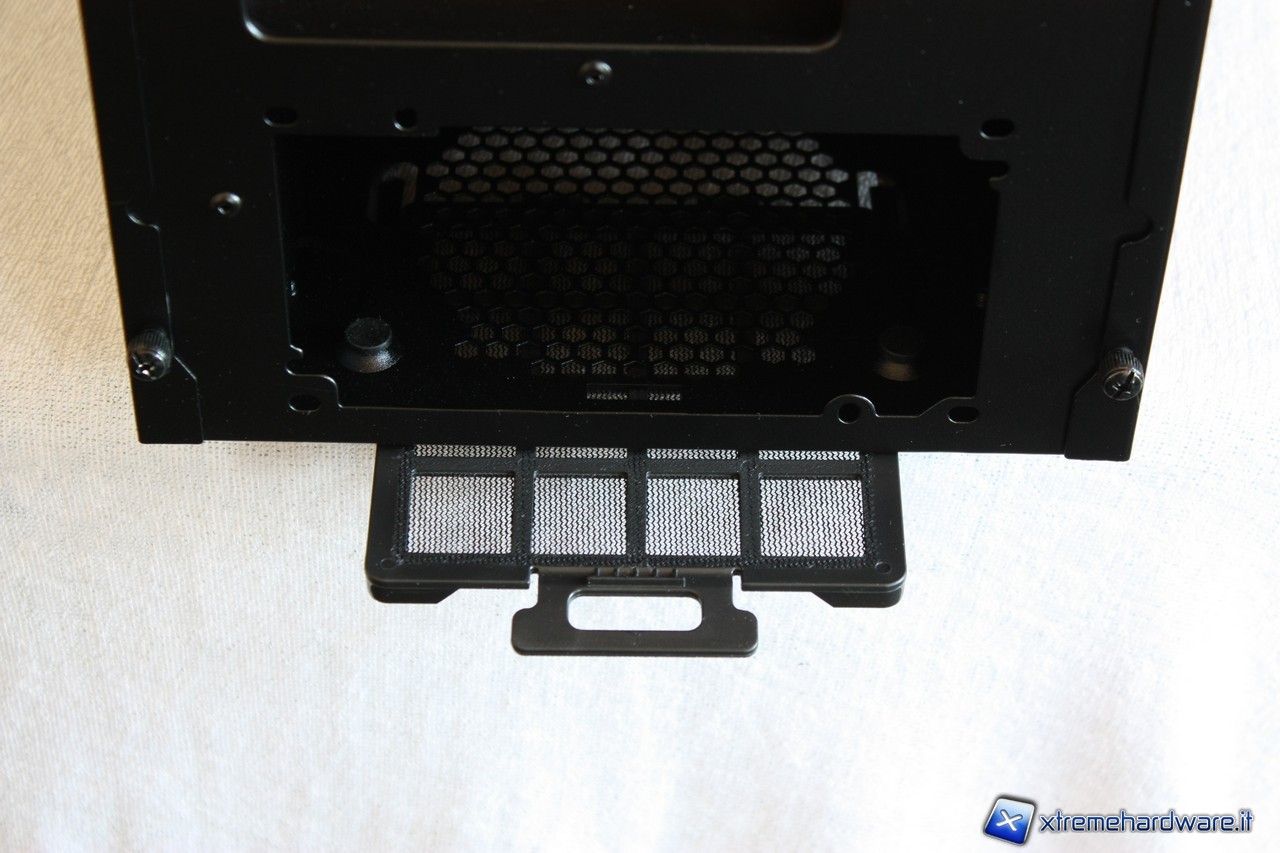 Nella sezione inferiore troviamo l'alloggiamento per l'alimentatore, che in questo cabinet è posto nel fondo; una soluzione che bilancerà i pesi e permetterà al nostro psu di prelevare aria fresca dall'esterno del case. Un pratico e comodo filtro estraibile dall'esterno proteggerà il nostro alimentatore dalla polvere, particolarmente insidiosa se il case viene poggiato in terra.