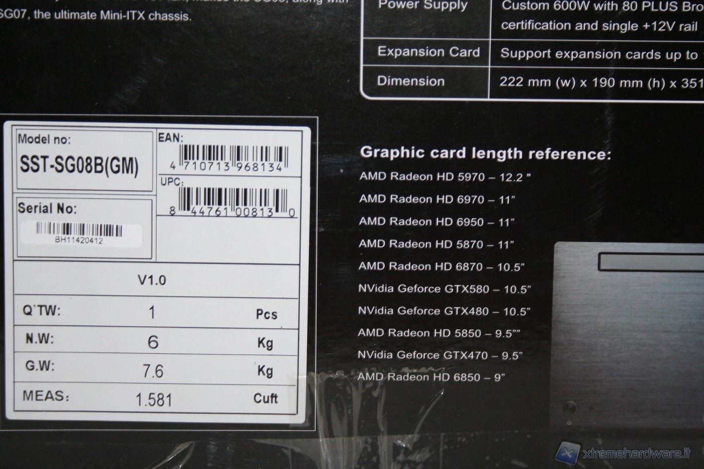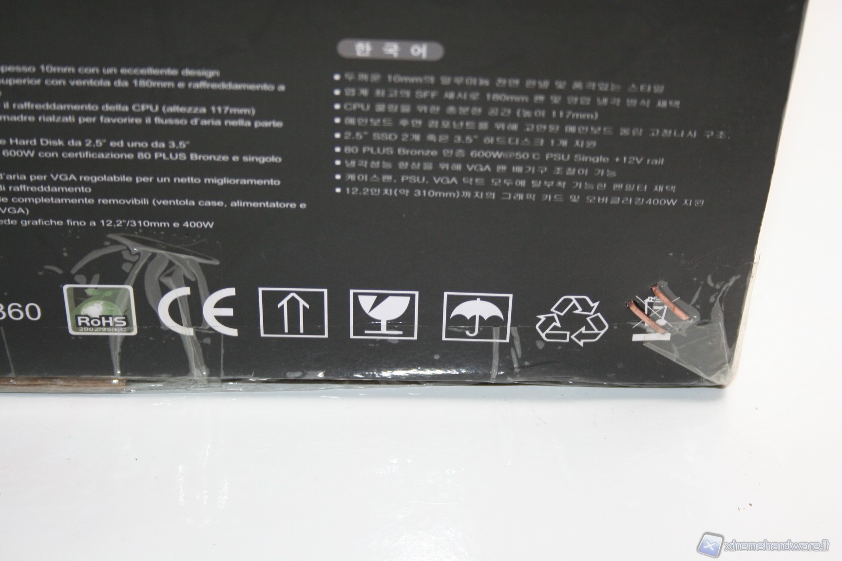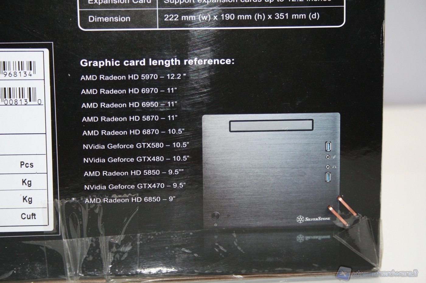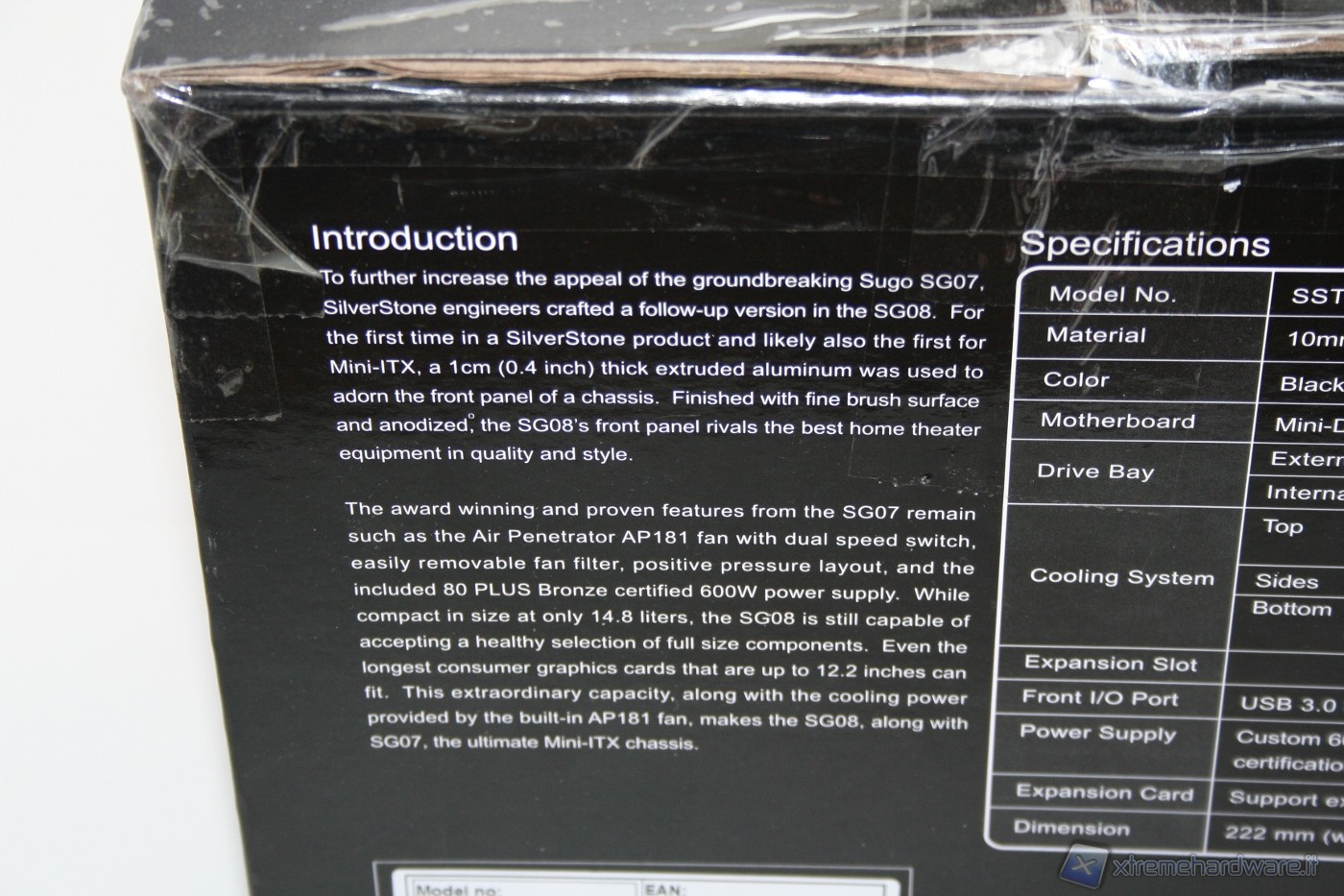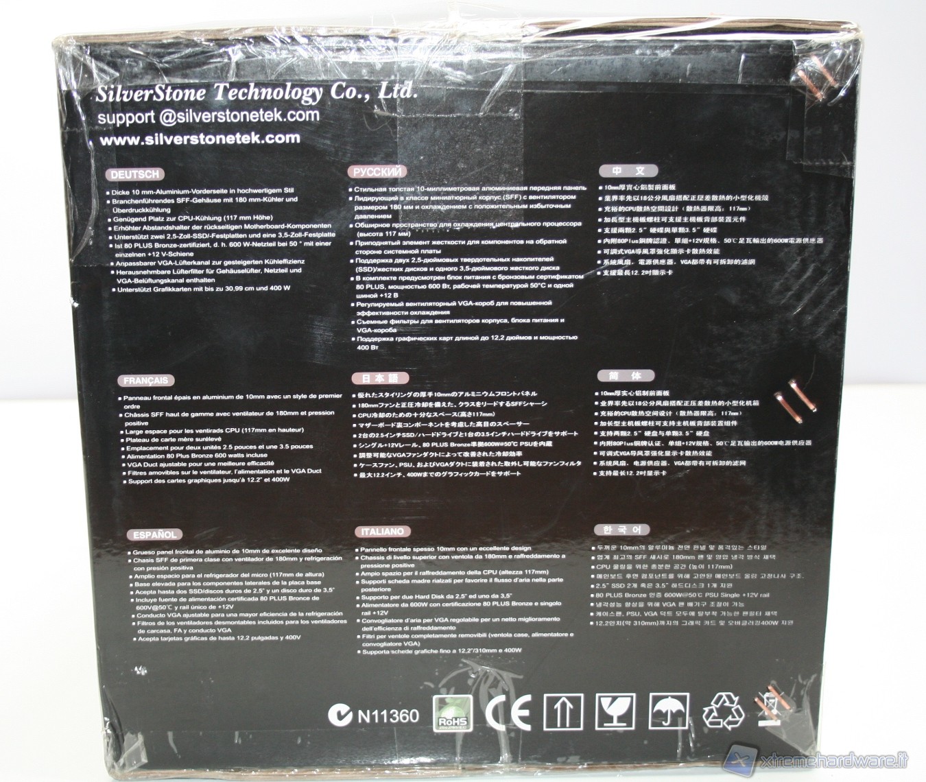 Il cabinet è stato imballato nel classico ed ottimo box SilverStone. Ottime le foto, molte le informazioni dettagliate e adeguata la descrizione dell’unità. All’interno il cabinet è al riparo da potenziali urti grazie a due gigantesche protezioni in polistirolo, cartone protettivo ed una grande busta di plastica contro graffi accidentali.