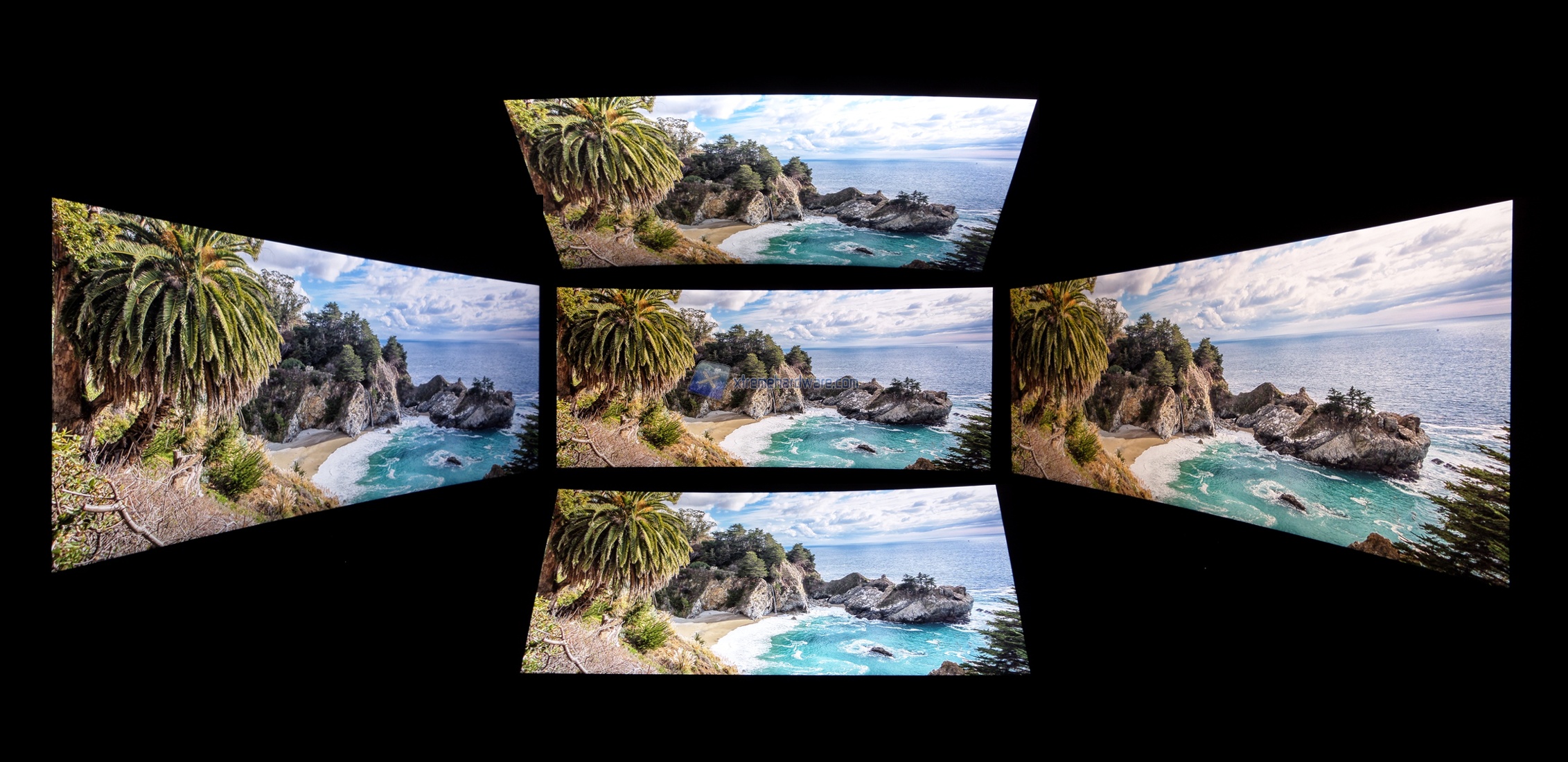 Suddividendo lo schermo in nove rettangoli, abbiamo misurato con il colorimetro l’uniformità della luminosità e dei colori. La differenza massima registrata è risultata pari al 7%, con una media del 3,8%, per quanto riguarda la luminosità, mentre per il colore, il Delta-E maggiore è stato di 2,1, con una media dell’1,2. La media scende rispettivamente al 2,6% e a 0,8 attivando la modalità SmartUniformity.