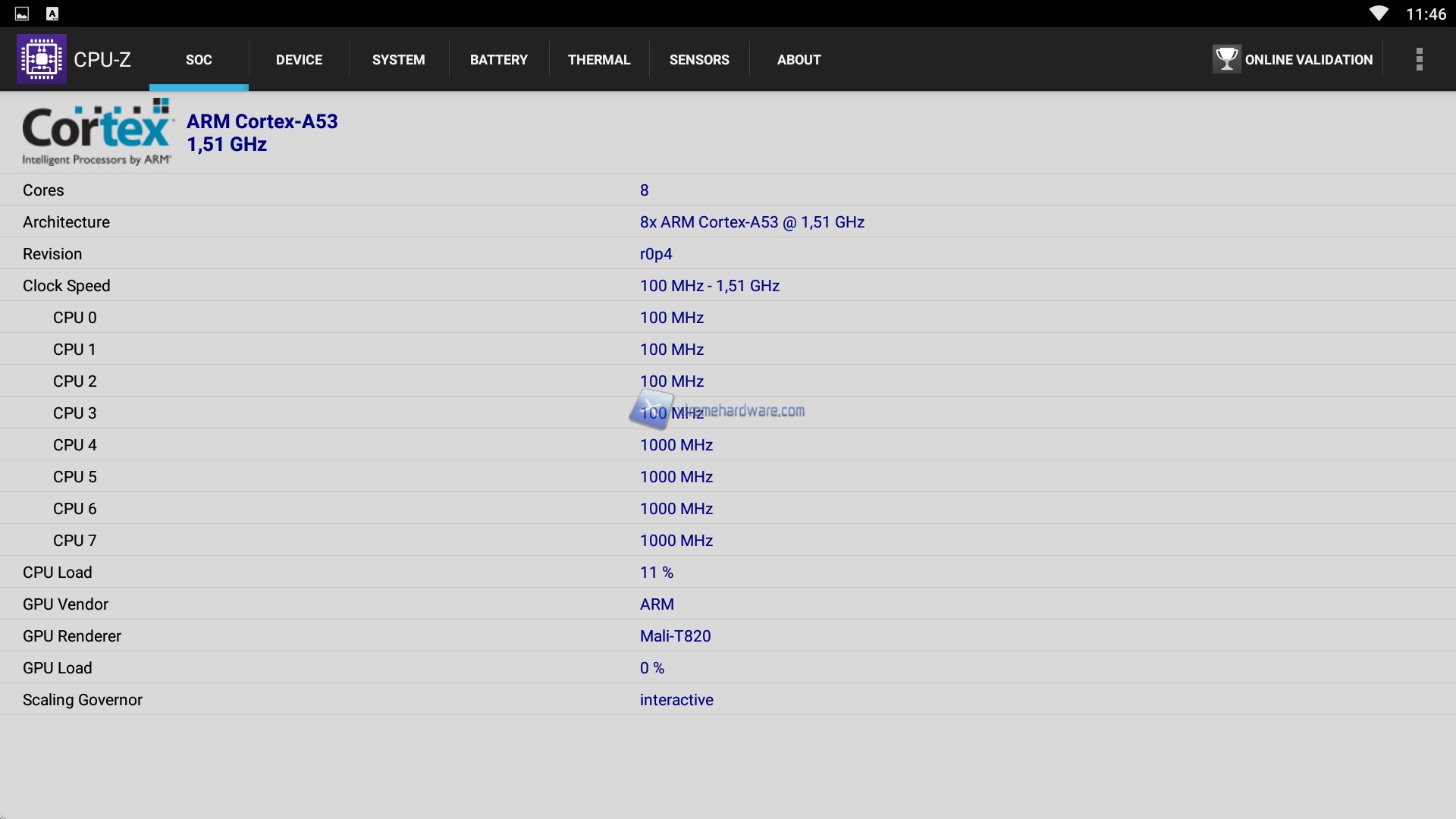Come prima cosa abbiamo scaricato e installato CPU-Z per verificare a fondo i dettagli tecnici ed Hardware del PROBOX2 Air Plus. Installato ed avviato come vediamo subito ci viene mostrata l’architettura Octa Core della CPU Amlogic S912 su base ARM Cortex-A53 con frequenza minima di 100 MHz e massima di 1,51 GHz. Inoltre, è confermato il comparto grafico affidato ad una Mali T820, GPU SoC, di fascia bassa che supporta OpenGL ES 3.2 con una frequenza di 600 Mhz ed una cache di livello 2 massima di 512KB. La RAM disponibile è di 3GB a cui si aggiungono i 32GB di eMMC per app e dati. A seguire notiamo come sia implementato un sistema Android Marshmallow 6.0.1.