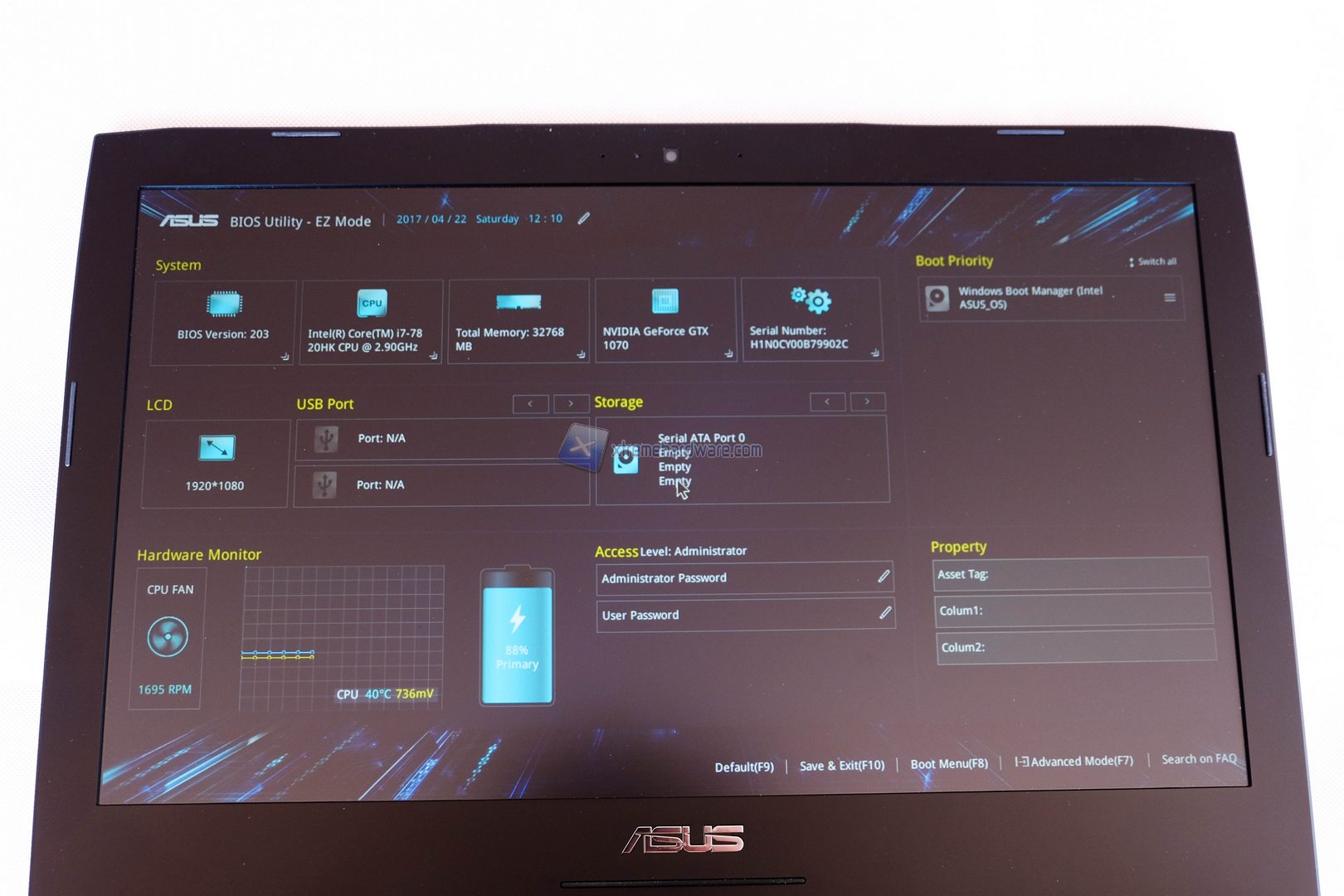 Per accedere al BIOS del nostro Asus G752VS ci basterà come in ogni altro Notebook premere il tasto F2 o Canc. Il BIOS in questo caso è la più recente tipologia UEFI. La prima pagina che troviamo dopo aver compiuto l’accesso è quella in modalità “easy”, ossia una schermata che non ci permette di modificare i parametri più importanti del PC ma in grado di esporre le maggiori informazioni sul prodotto in maniera chiara e precisa.